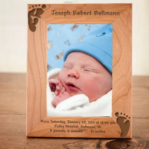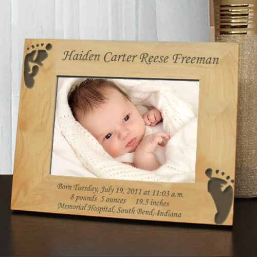 Personalized baby frame with a foot print silhouette on the upper right and lower left corner, each of these baby frames are personalized with the name of the baby and the birth information. The baby frame is made of a natural finished solid alder wood with a black easel. This beautiful frame can be displayed out on a table or easily wall mounted.
