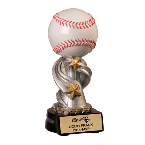 Encore 7″ resin trophy with a baseball theme. Each of these trophies feature a baseball on a silver pedestal with stars spiraling around it.
