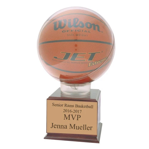 This basketball holder is a clear plastic holder set on a wooden pedestal