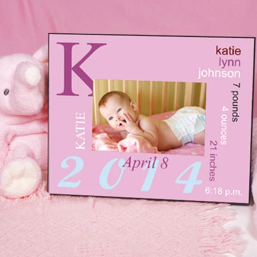 Display your new born child or grandchild in this personalized frame. These frames are available in blue or pink and are customizedwith all of your new little one’s information.The frames are made to hold a 4×6 horizontal frame. These frames are ready for sitting on a table or hanging on a wall. Select your color andstart personalizing!