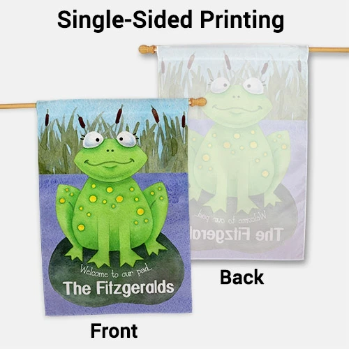 Printed with a frog on his pad with the text “Welcome to our pad” add your family name for a fun way to welcome your guests.
