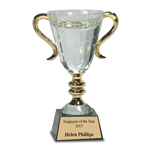 This award features a crystal cup with gold handles mounted on a solid black base. A brass plate will be added with your personalization.