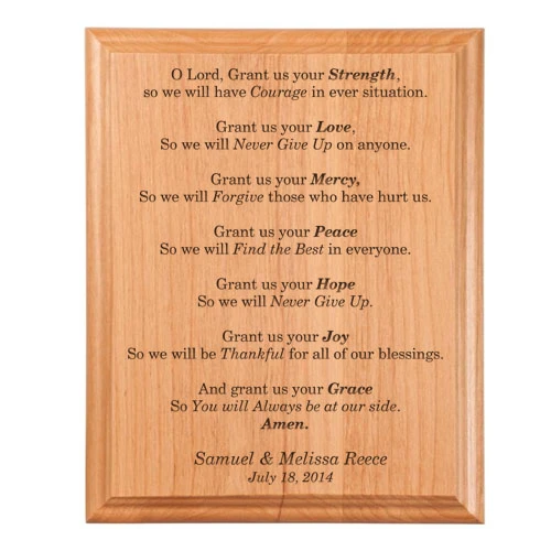 This prayer plaque is a great gift for any individual or couple. Personalize with a name and date or custom message. This plaque comes in various sizes to fit in any home, office, room, or lobby. Great for any occasion.