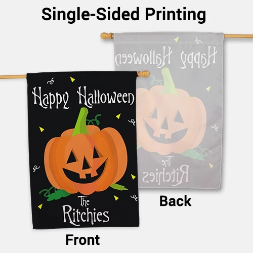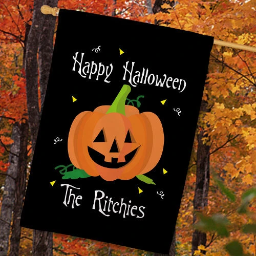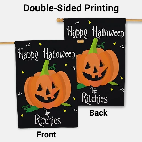 Add your family name to the bottom of this flag for a one of a kind decoration. Happy Halloween and the smiling pumpkin will already be printed.