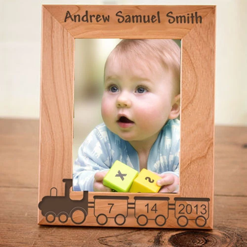 This wooden picture frame has been designed with an engraved name of the baby along the top of the frame, and on the bottom a train pulling 3 cars that carry the birth information. This is a great gift idea for any new baby, new parents, or grandparents.